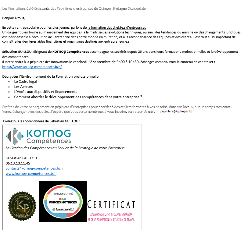 Formation en Pépinière,Non classé Stratégie : la formation en entreprise Posté le 25 février 202625 mars 2026 par pepiniere 25 Fév pepiniere Atelier de formation : le pitch Atelier interactif : Améliorez votre visibilité sur le Web